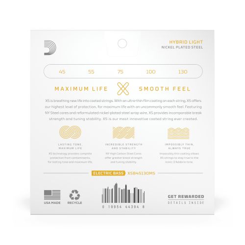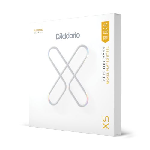 XS Nickel Bass strings combine a premium nickel-plated wrap wire with an ultra-thin coating for a smooth feel, maximum life, and punchy, balanced tone. Designed for bassists who demand durability without sacrificing clarity or response. 45-130 Hybrid Light provides players with an extremely versatile and balanced tension set for 5-string multi-scale basses.