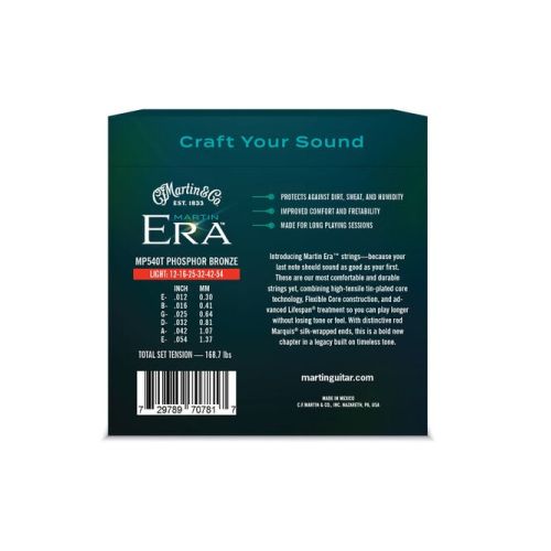 Built to achieve unmatched tone and playability, Martin Era™ strings set a new standard for what a phosphor bronze acoustic guitar string can be. Combining the best technologies from the Martin Strings lineup, Martin Era strings feature a patented Lifespan® treatment to protect against corrosion, Flexible Core construction to enhance fretability and comfort, and silk-wrapped ball ends—designed with vintage instruments in mind and as a premium touch that symbolizes Martin’s handcrafted string-making history. The Artist Light version was developed in collaboration with six-time GRAMMY® winner Jason Isbell and features a more traditional SP® core to match his signature guitar sound.
