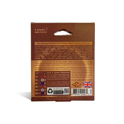 Rotosound's best selling acoustic string. Phosphor Bronze wound Acoustic Guitar strings with superb warm tone, clarity and sustain. Favoured by such artists as John Renbourn, Bob Geldof and Gordon Giltrap.