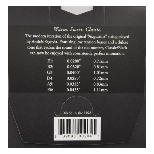 Black/ zilver set snaren voor klassieke gitaar, lage spanning, helder & zilver. Dit zijn de originele gitaarsnaren van Augustine, een intrinsiek onderdeel van de klassieke gitaarrevolutie van deze eeuw. Albert Augustine, een instrumentmaker, werd door niemand minder dan Andres Segovia onder druk gezet om nylon gitaarsnaren te gaan produceren en verkopen. Hij deed dit en hiermee verzekerde hij de opkomst van een nieuwe generatie concertspelers en zijn eigen aandeel in de cultivatie en voltooiing van de beroemde Segovia Sound.