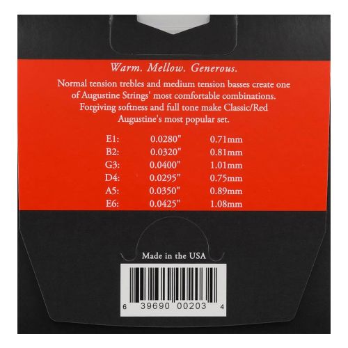 Red set snaren voor klassieke gitaar, medium spanning. Dit zijn de originele gitaarsnaren van Augustine, een intrinsiek onderdeel van de klassieke gitaarrevolutie van deze eeuw. Albert Augustine, een instrumentmaker, werd door niemand minder dan Andres Segovia onder druk gezet om nylon gitaarsnaren te gaan produceren en verkopen. Hij deed dit en hiermee verzekerde hij de opkomst van een nieuwe generatie concertspelers en zijn eigen aandeel in de cultivatie en voltooiing van de beroemde Segovia Sound.