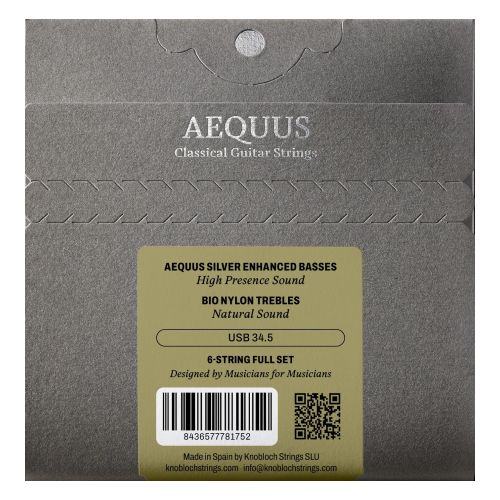 Aequus Silver Enhanced basses project each note with stability, maintaining precise harmonic balance across bass, midrange, and treble. Their character is especially evident in the mid register, where the guitar resonates with greater richness and control. BIO Nylon trebles have been technically refined to ensure faster and more precise adaptation to the instrument. Thanks to their optimized balance, they deliver a more natural and expressive tone in the upper register, completing the overall balance of the set. A high-performance string, meticulously designed to deliver precision and control across the entire range.For musicians seeking balance, control, and a present sound with enhanced detail and definition.