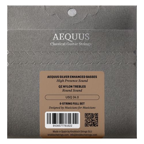 Aequus Silver Enhanced basses project each note with stability, maintaining precise harmonic balance across bass, midrange, and treble. Their character is especially evident in the mid register, where the guitar resonates with greater richness and control. QZ Nylon trebles provide a smooth attack and controlled clarity, balancing the set without adding excessive brilliance and offering a uniform tonal color that complements the basses. A high-performance string, meticulously designed to deliver precision and control across the entire range. For musicians seeking balance, control, and a present sound with enhanced detail and definition.